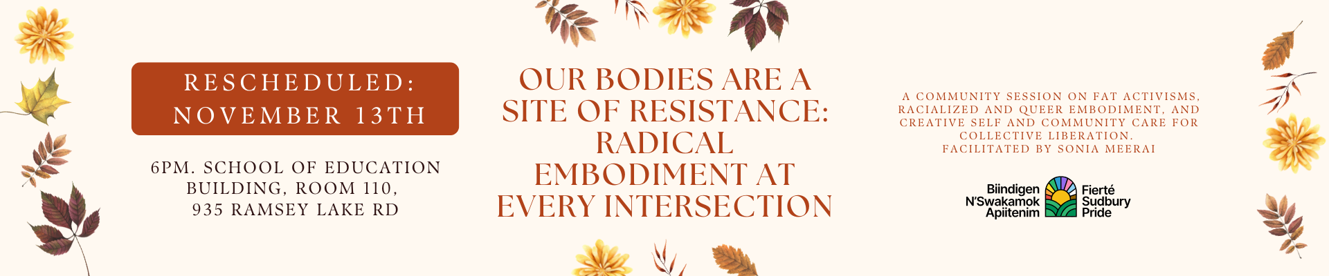 While there are no Indigenous or Two-Spirit symbols in this concept, we are honouring Indigenous presence by including the Anishinaabemowin translation of Welcoming Sudbury Pride: Biindigen N’Swakamok Apiitenim.