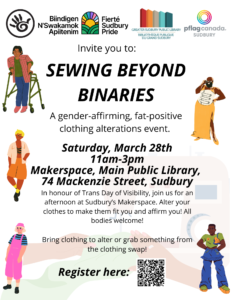 In honour of Trans Day of Visibility, join us for an afternoon at Sudbury’s Makerspace. Alter your clothes to make them fit you and affirm you! All bodies welcome! Everyone welcome!